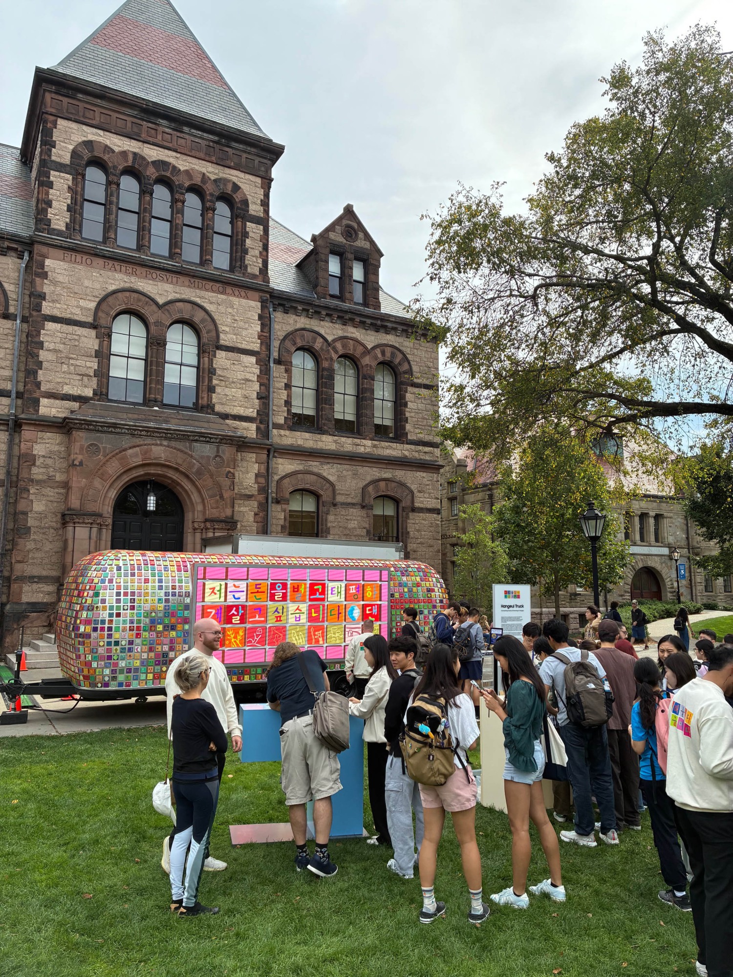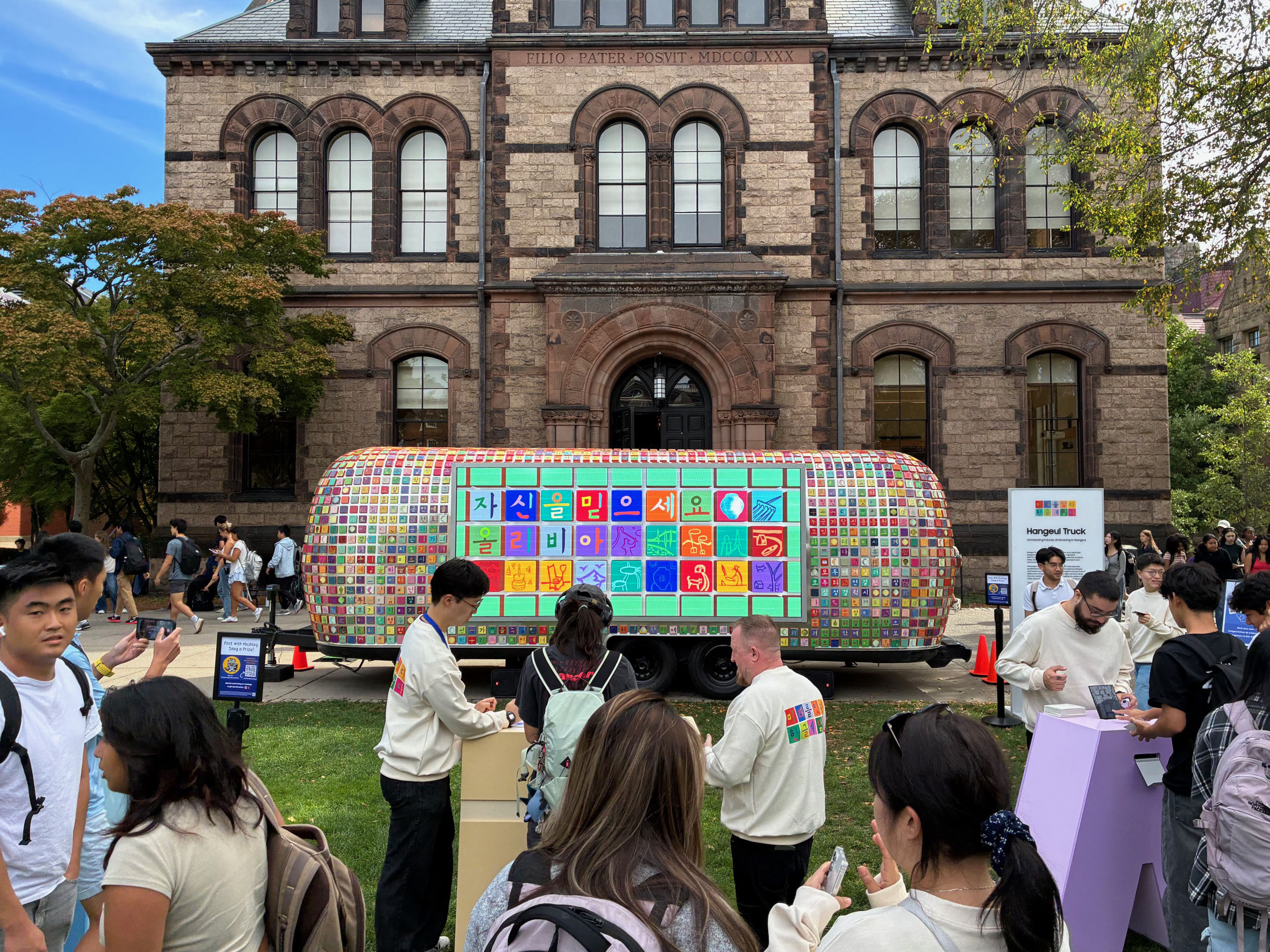 Arriving most recently from Harvard and heading off to Yale, the Hangeul Truck is on a tour of several East Coast universities. Today on the main green, Brown students were busy exploring the language and participating in the Korean holiday which celebrates this alphabet.